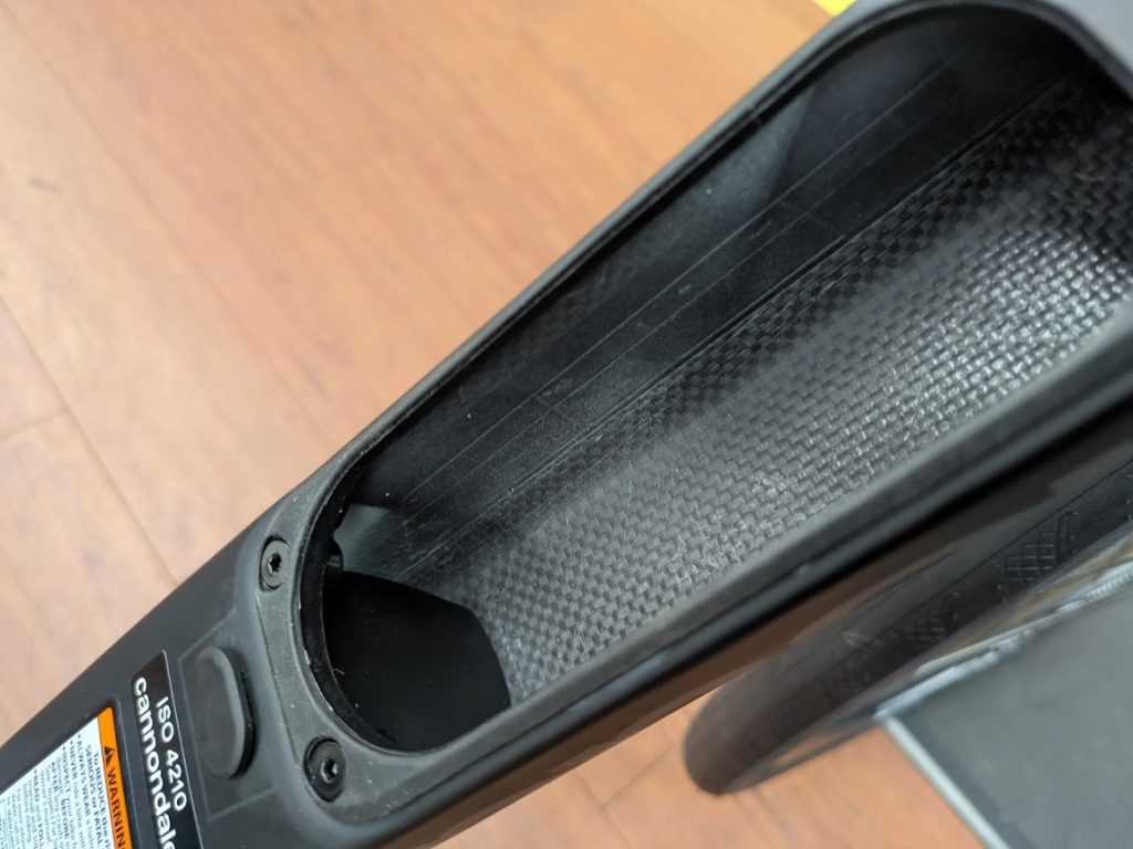 収納スペースが現れます。今回のcarbon5は二世代目smart sense対応となっていますので、後付けで取り付けが可能です。下の黒い部分にバッテリーが内蔵できます。