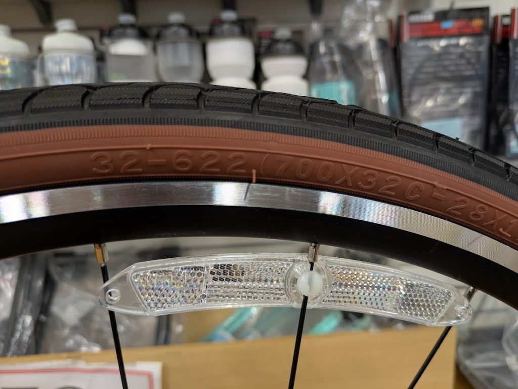 タイヤは32Cと街乗りからちょっとしたサイクリングにも対応できるサイズです。最近ではロードバイクもこれぐらいのサイズを履いています。
