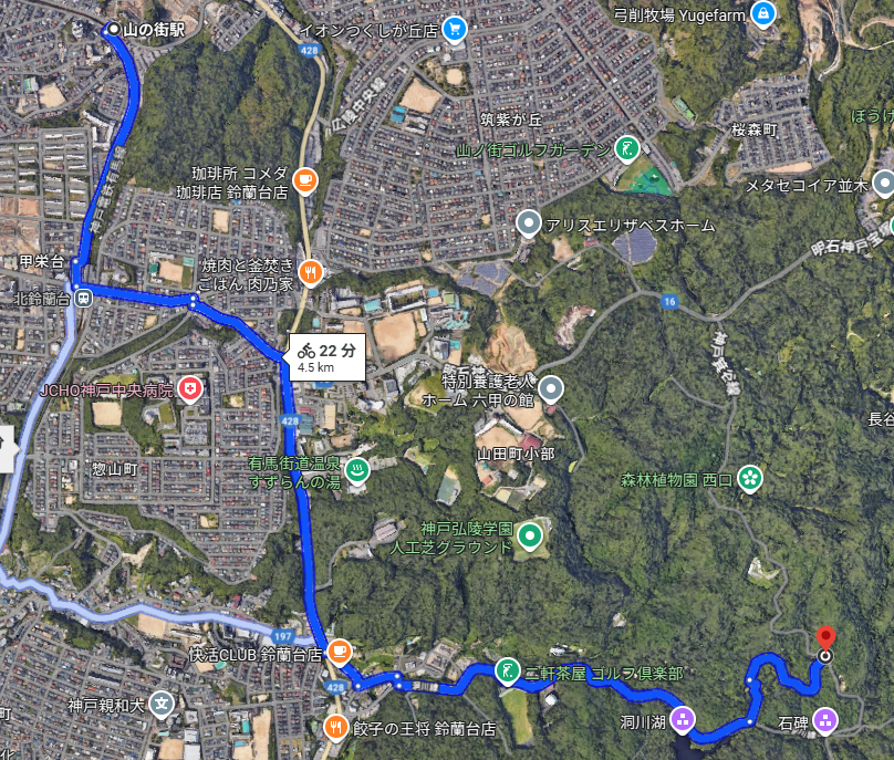 ルート検索では22分と出てますが、mtbだとまずかなりしんどいです。30分以上は見ておいた方が良いです。どうしてもかなりの登り区間になりますので、しんどければ押して歩いても良いと思います。
