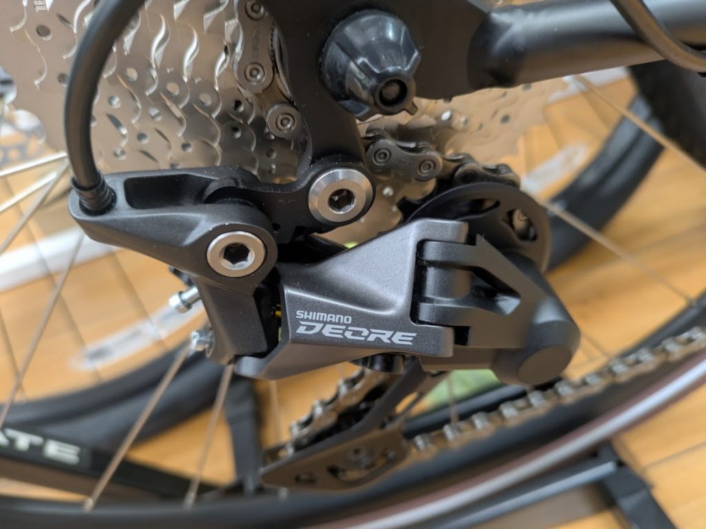 コンポーネントはクランク以外はシマノで統一されており、リアメカはDEOREがついています。リアはワイドなギア比になっていますが、DEOREということもあり、かなり変速のタッチ感も滑らかになっています。