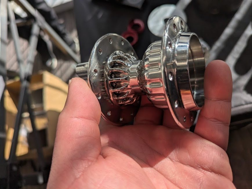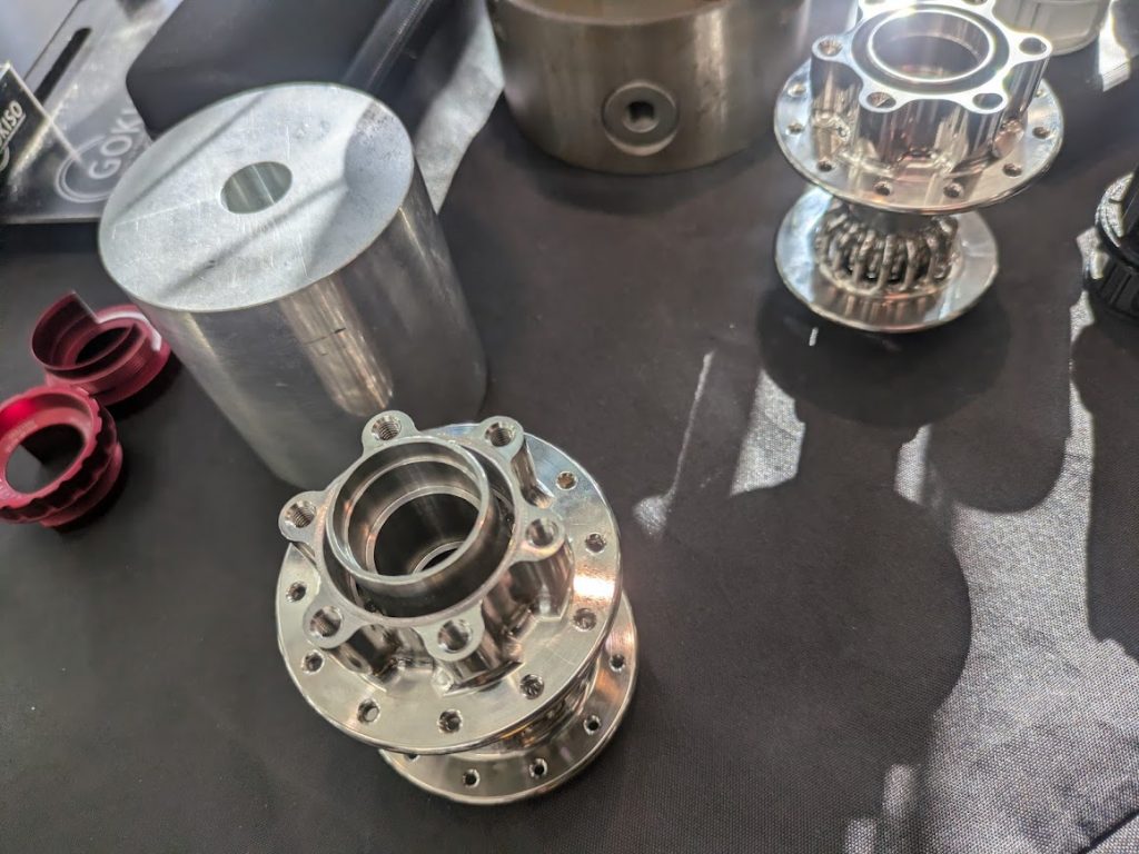そして、このハブは削り出しを行っています。奥にあるアルミの丸棒から削り出して