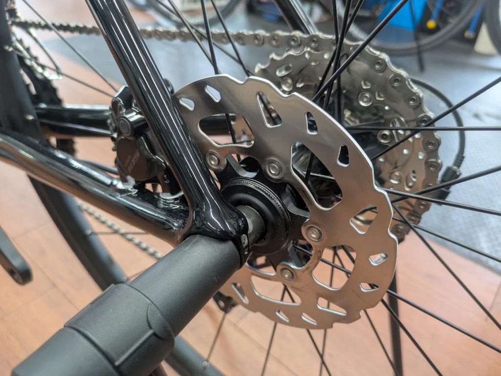 ブレーキはリアが140MMにしてあります。実際のところ、CAAD14の用途を考えれば別に異径ローターでも構わないと思います。