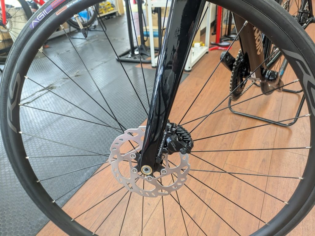 ホイールはシマノのRS171になります。シマノホイールになっているので、完成車よりは少しグレードがいいかなといかなと思います。